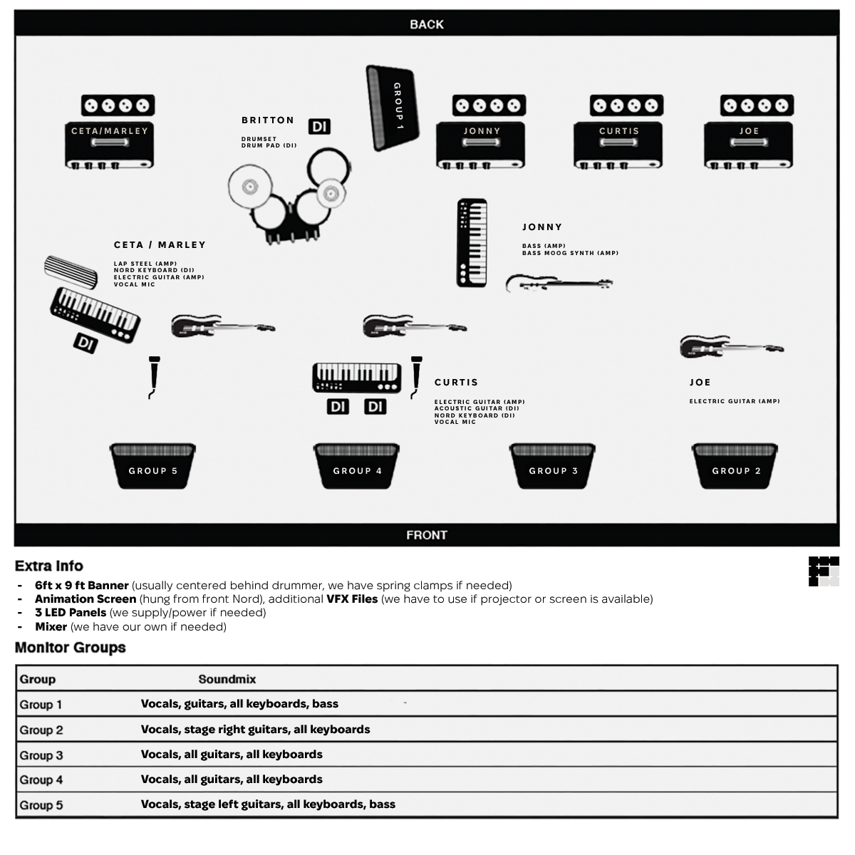 We require basic stage power (standard 110V outlets across the backline and front-of-stage) and enough DI inputs for synths, bass, and additional effects.